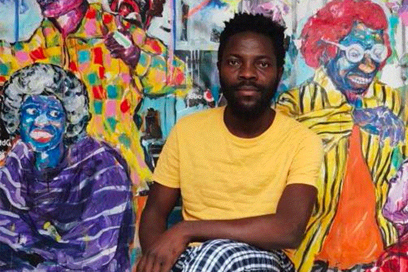 Atsoupé, artiste togolaise née en 1986, explore un paradoxe entre l’enfance et la violence dans ses œuvres. Son travail se compose de poupées sans visage et de portraits, qui évoquent des esprits et créent un lien entre passé et futur. Les poupées, féminines et faites de matériaux variés comme le fer, le tissu et le cuir, sont ornées de motifs floraux naïfs, rappelant la jeunesse. Ses portraits, réalisés dans des palettes maîtrisées de bleu de Prusse, rouge carmin et vert jade, présentent des figures anonymes. Ces visages mystérieux, parfois troués ou recousus, traduisent une mélancolie profonde et une tension entre douceur et brutalité.